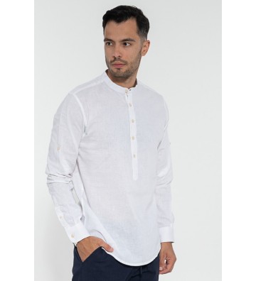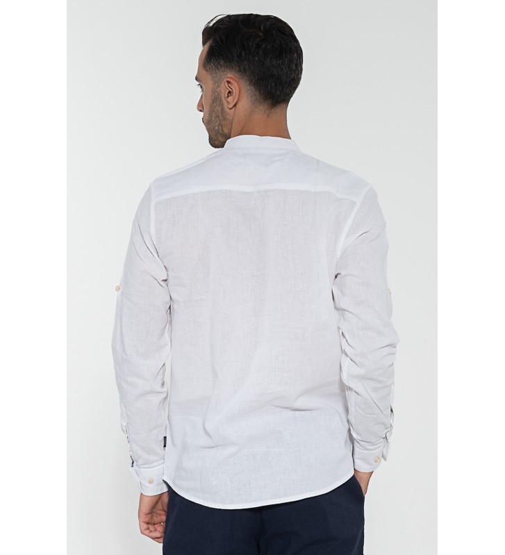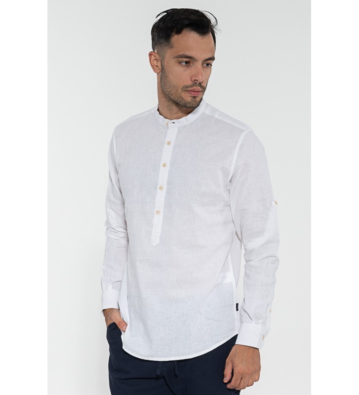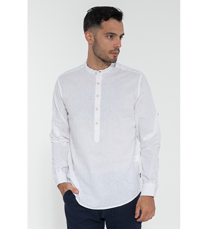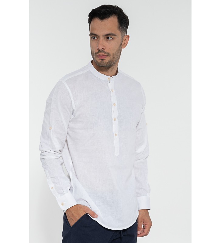 Λινό πουκάμισο μάο, μακάρι μανίκι. Μπορεί να φορεθεί με βερμούδες και παντελόνι chino.
