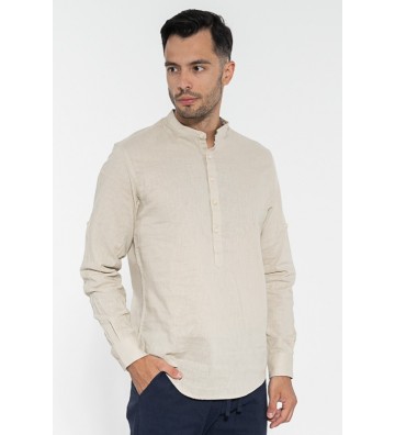 Λινό πουκάμισο μάο, μακάρι μανίκι. Μπορεί να φορεθεί με βερμούδες και παντελόνι chino.