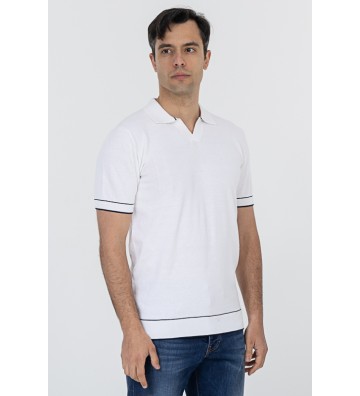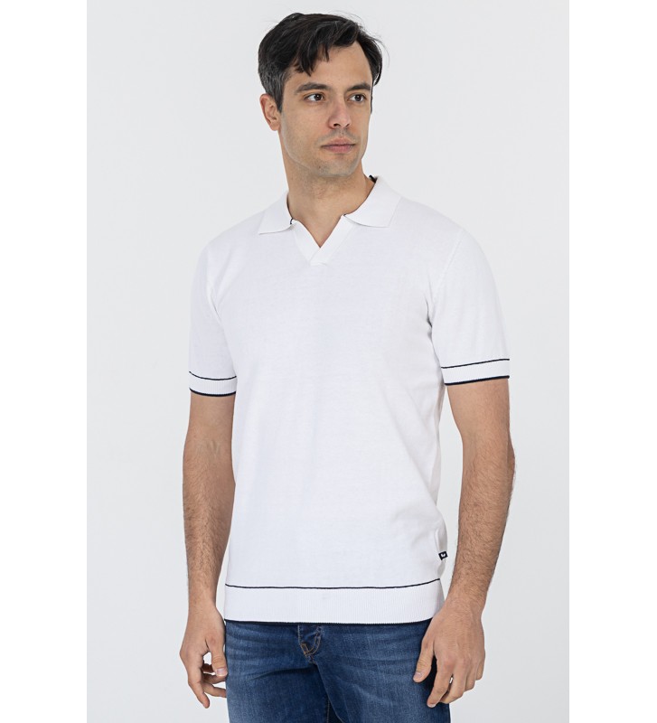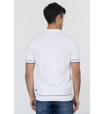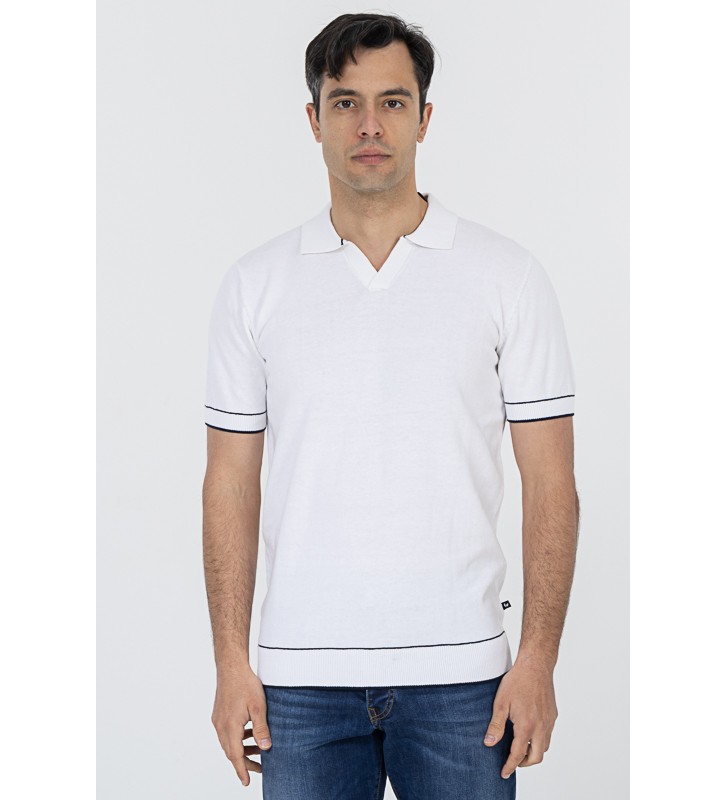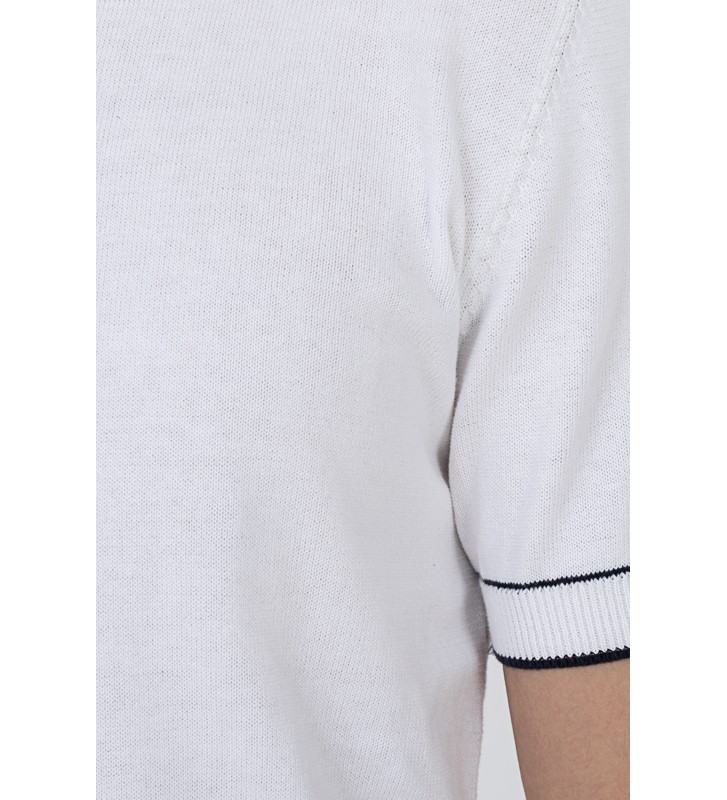 Πλεκτό μπλουζάκι τύπου πόλο με κοντά μανίκια, γιακά και V άνοιγμα χωρίς κουμπιά, διακριτικές λεπτομέρειες στα μανίκια και στο τελείωμα