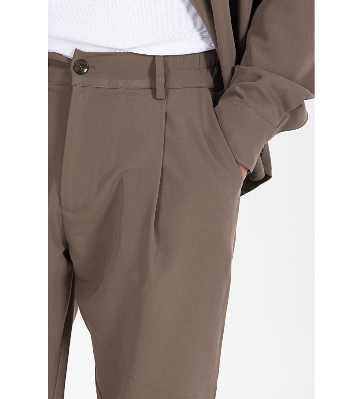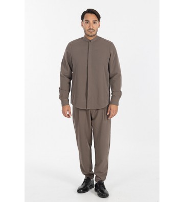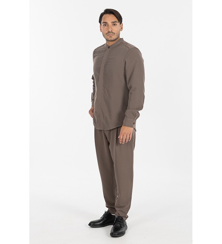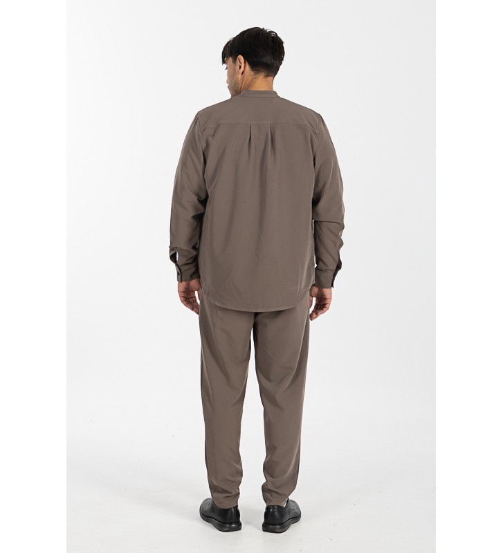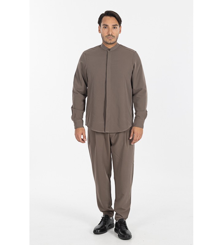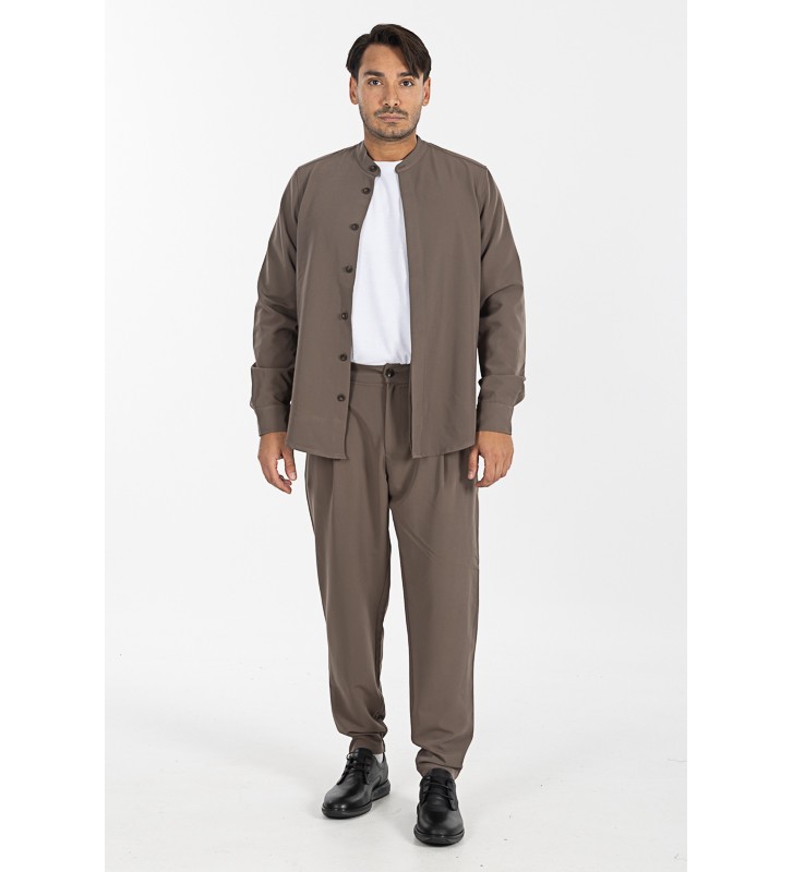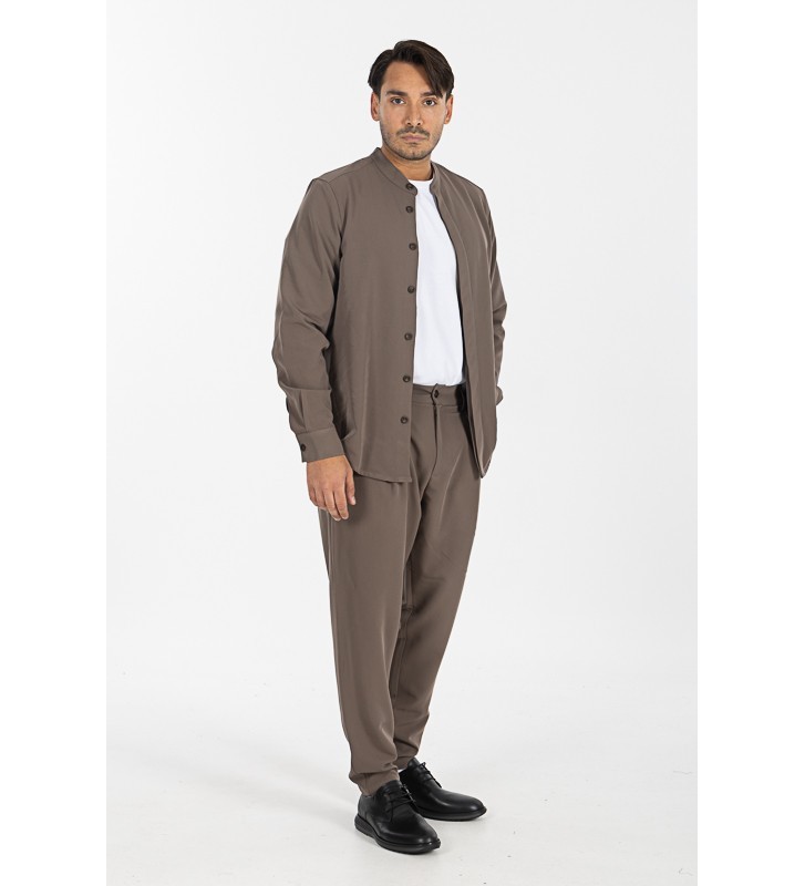 Το σετ αποτελείται από πουκάμισο με μακριά μανίκια και μάο γιακά, με κρυφή πατιλέτα και άνετη, κομψή εφαρμογή. Το παντελόνι έχει ίσια γραμμή, διακριτικές πιέτες και πλαϊνές τσέπες, προσφέροντας άνεση και πρακτικότητα. Συνολικά, το σύνολο αποπνέει μοντέρνα και λιτή αισθητική, κατάλληλη για κάθε περίσταση.